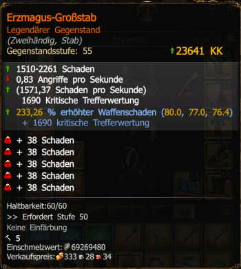 Den Stab vom letzten Mal habe ich übrigens immernoch. 310% WS wären also nach einer neuen Crafting-Runde möglich. :D (Oder eben das Ausbauen der KW, da der Stab mich von 38% auf 64% hochhaut...)
